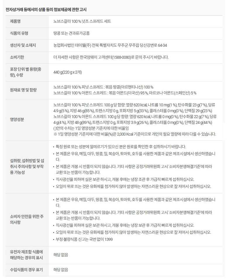 암웨이 노브스갈라 100% 넛츠 스프레드 세트 440g(220g x 2개)