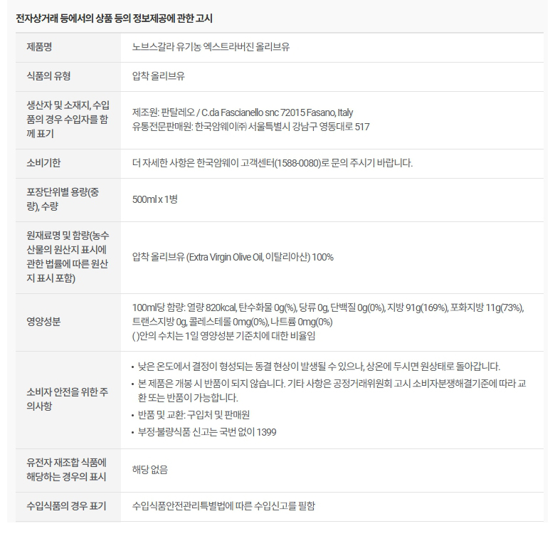 암웨이 노브스갈라 유기농 엑스트라버진 올리브유 500ml