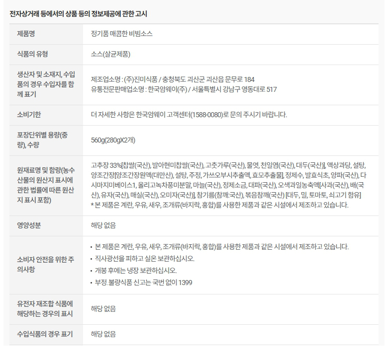 암웨이 정기품 매콤한 비빔소스 560g(280gX2개)