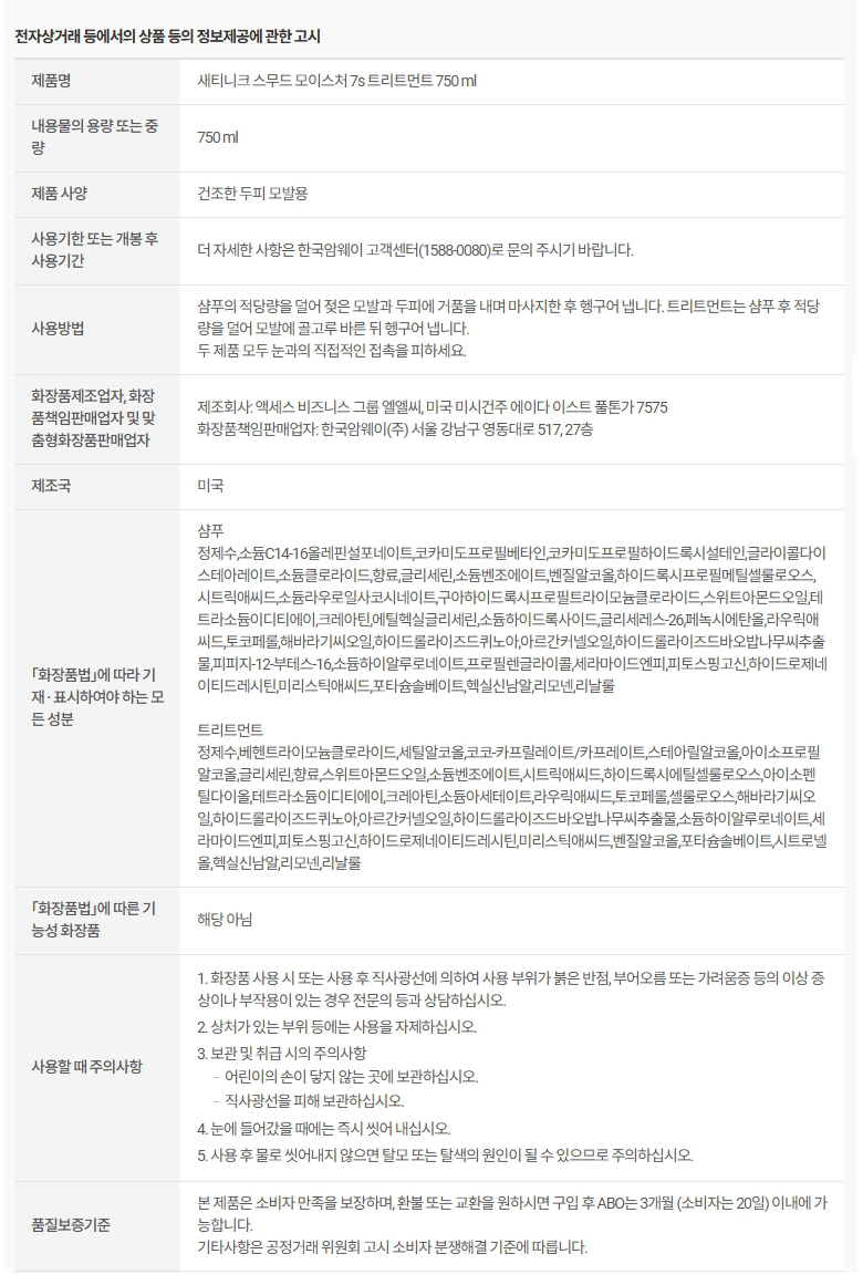 암웨이 새티니크 스무드 모이스처 7s 트리트먼트 750 ml