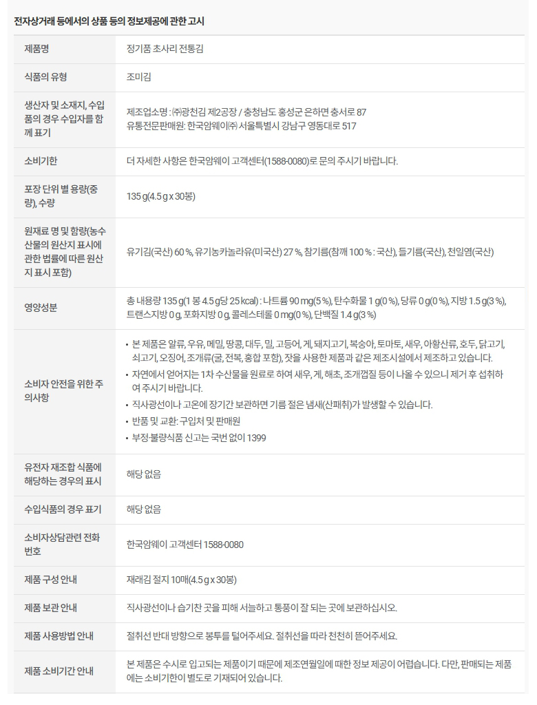 암웨이 정기품 초사리 전통김 135g(4.5g x 30봉)