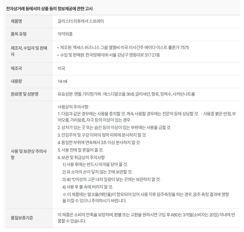 암웨이 글리스터 리후레셔 스프레이 멘톨향