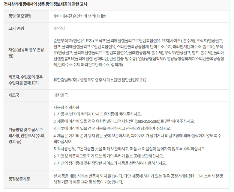 암웨이 후아 내추럴 순면커버 생리대 대형 32개입