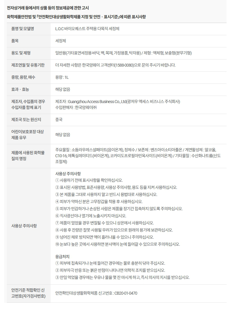 암웨이 L.O.C 바이오퀘스트 주택용 다목적 세정제 1L