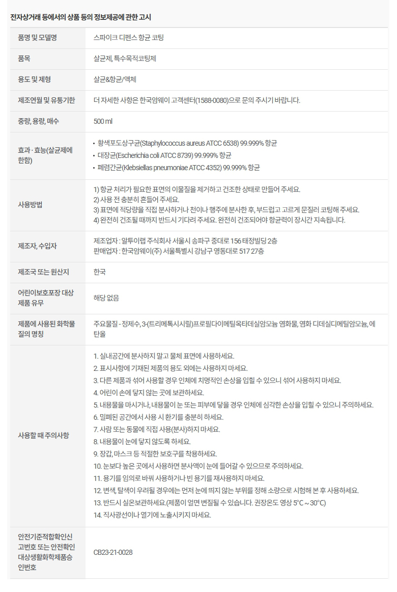 암웨이 스파이크 디펜스 항균 코팅 500ml