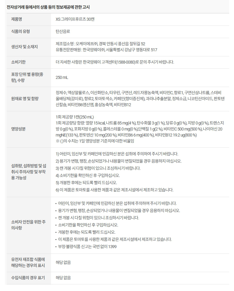 암웨이 XS 그레이프 후르츠 250ml (30캔)