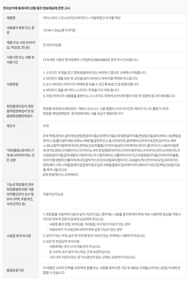 암웨이 아티스트리 스킨 뉴트리션 비타민 C + 히알루론산 트리플 액션 12ml