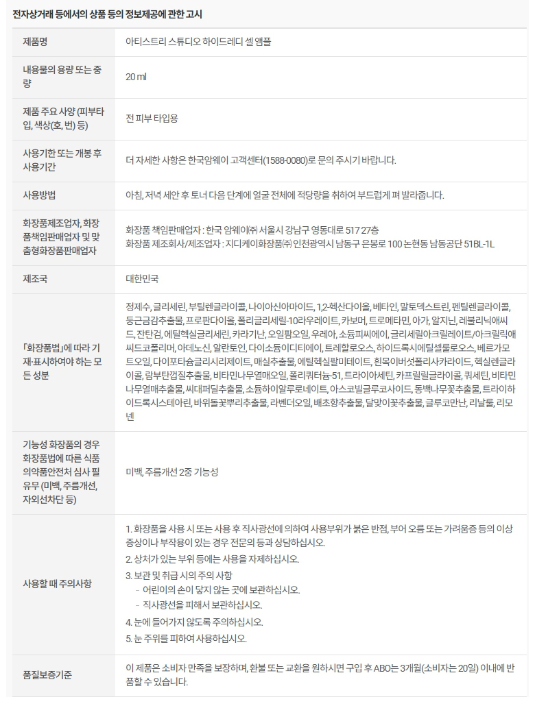암웨이 아티스트리 스튜디오 하이드레디 셀 앰플 20ml