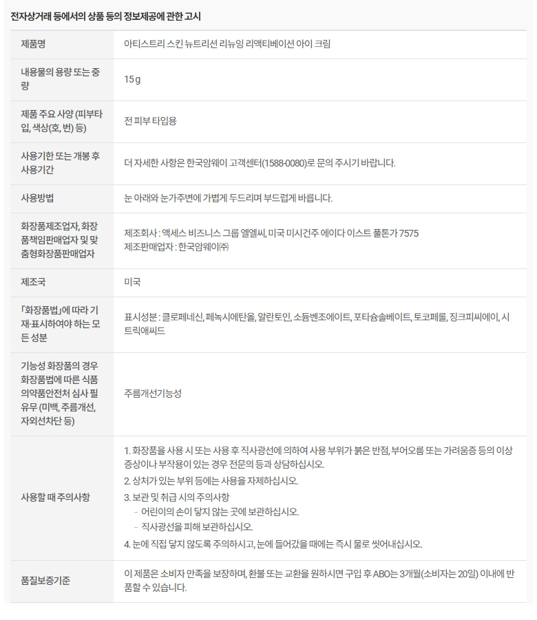 암웨이 아티스트리 스킨 뉴트리션 리뉴잉 리액티베이션 아이 크림 15g