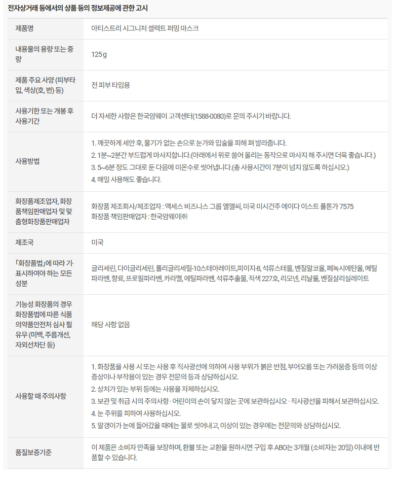 암웨이 아티스트리 시그니처 셀렉트 퍼밍 마스크 125g