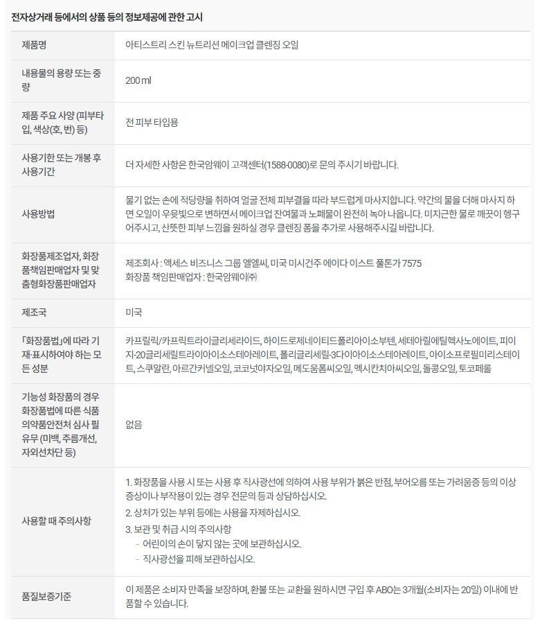 암웨이 아티스트리 스킨 뉴트리션 메이크업 클렌징 오일 200ml
