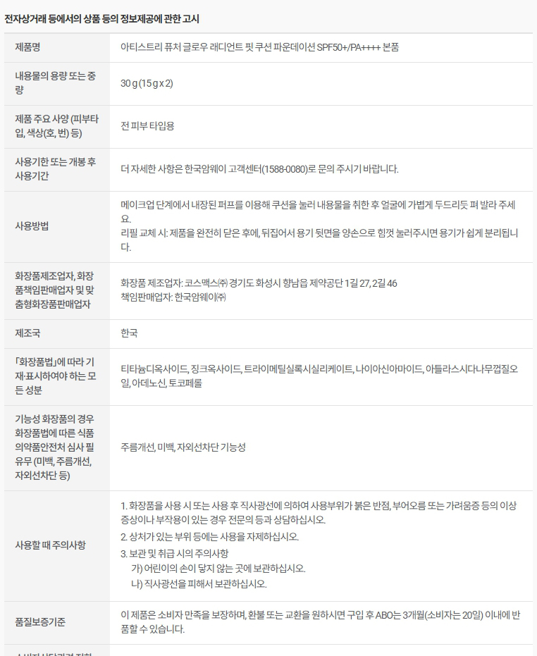 암웨이 아티스트리 퓨처 글로우 래디언트 핏 쿠션 파운데이션 본품 SPF50+/PA++++