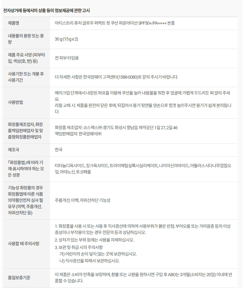 암웨이 아티스트리 퓨처 글로우 퍼펙트 핏 쿠션 파운데이션 본품 SPF50+/PA++++