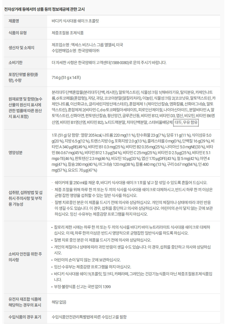 암웨이 바디키 식사대용 쉐이크 초콜릿 (14포)