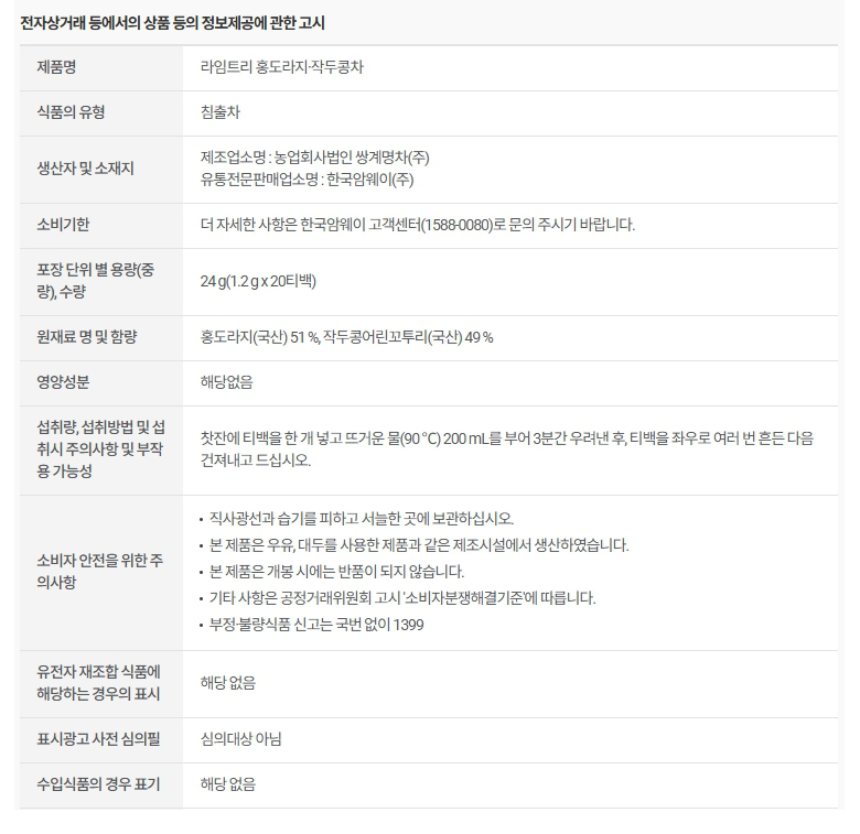 암웨이 라임트리 홍도라지·작두콩차 20티백