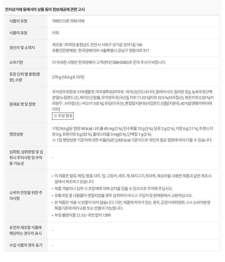 암웨이 까페드다몬 까페 라떼 (18.6g X 15개)