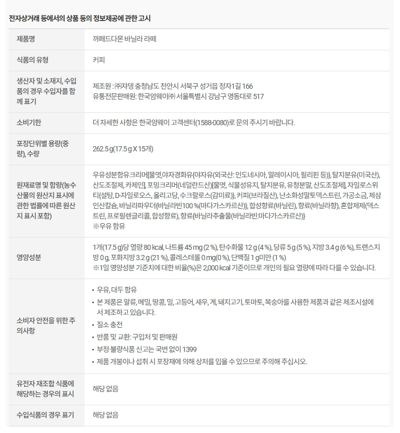 암웨이 까페드다몬 바닐라 라떼 (17.5 g X 15개)