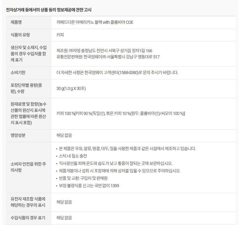 암웨이 까페드다몬 아메리카노 블랙 with 콜롬비아 COE (1.0g X 30개입)