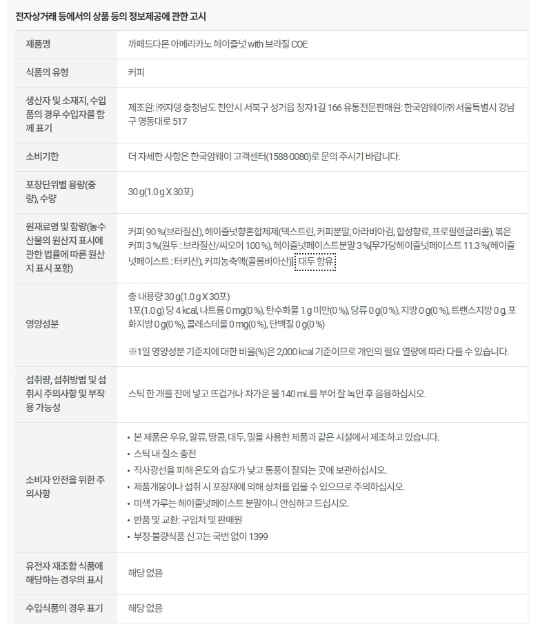 암웨이 까페드다몬 아메리카노 헤이즐넛 with 브라질 COE (1.0g X 30개입)